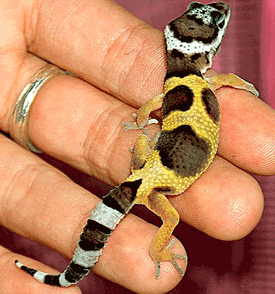 Leopard geckos are lizards native to Pakistan, India, and Afghanistan where the terrain is very dry and rocky. The geckos live on and under the ground and are nocturnal. A leopard gecko has a triangular head and a large tail where it stores fat. Its skin is very bumpy and heavily patterned; designed to help camouflage the gecko from predators.