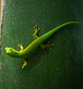 Indigenous to warm climates throughout the world, geckos are small lizards that are unique in being able to make chirping sounds for communication with other geckos. They are also unusual in having no eyelids – instead periodically licking the transparent membrane over their eyes clean with their tongue – and in having toes which have an amazing ability to adhere to many surfaces, without need for any surface tension or sticky liquids. An exception is the leopard gecko which does have eyelids and also does not have toe pads, so it cannot climb particularly well.