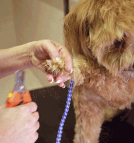 Nail clipping is essentially the process of cutting away excess nail, and the key is to learn just what is the "excess nail." If you can hear your dog's nails when he walks on a hard floor surface, there is probably a sufficient amount of excess nail to clip and/or file down. It is better to cut a small amount regularly than a large amount at once. However, since dogs may go many weeks between professional grooming appointments it is usually the task of owners to reasonably clip more excess nail.
